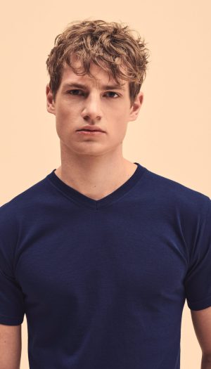 100% coton (sauf Heather Grey : 97% coton / 3% polyester et Dark Heather Grey 50% coton / 50% polyester). Col V en bord côte coton / Lycra® avec bande de propreté. Coupe tubulaire.