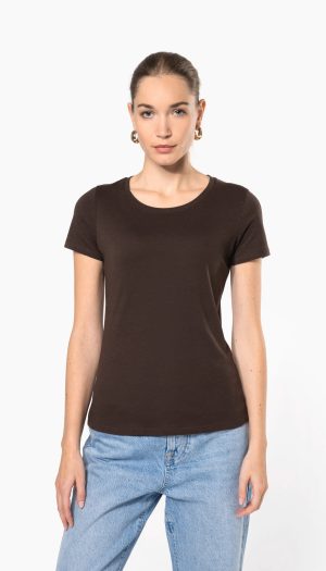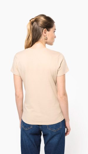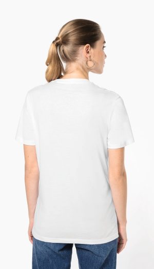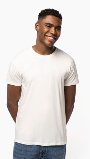 100% coton. Col en bord-côte 1×1 avec élasthanne. Bande de propreté ton sur ton à l’encolure. Pas d’étiquette de marque au col, uniquement une puce de taille pour faciliter la personnalisation.