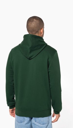 85% coton biologique / 15% polyester recyclé post-consumer. Surface extérieure 100% coton peigné. Molleton gratté 3 fils LSF (Low Shrinkage Fleece). Lavage aux enzymes. Coupe droite. Bord-côte 1×1 montage tubulaire pour une meilleure finition au bas de manches et de vêtement. Poche kangourou. Capuche doublée 100% coton, coton jersey 180g. Bande de propreté jersey ton…