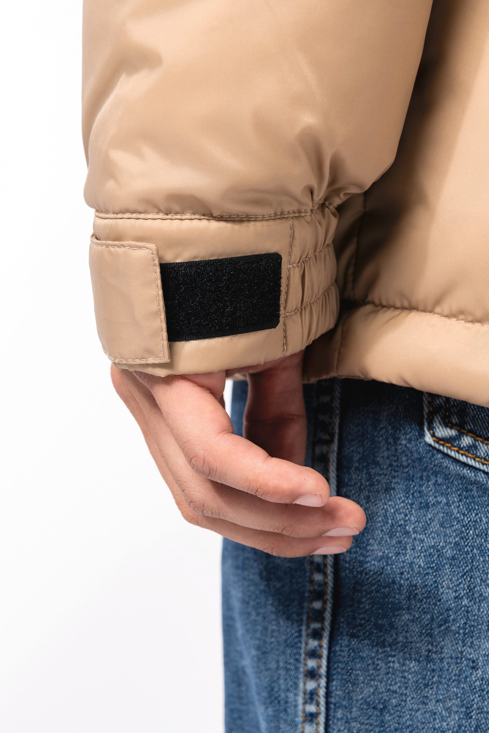Tissu principal : 100% polyamide 210T. Partie supérieure devant et dos : polyamide Taslon 500D. Tissu antistatique et déperlant. Doublure 100% polyester taffetas. Rembourrage 100% polyester. 2 poches zippées devant côtés avec zip inversé et tire-zip. Capuche : polyamide Talson 500D, matelassée et doublée en 3 parties avec cordon de serrage et stoppeur. Poche intérieure avec fermeture par bande auto-agrippante. Bas de manches élastiqué avec bande auto-agrippante. Ourlet avec lien de serrage et stoppeurs aux côtés sur le bas de vêtement. Zip invisible de personnalisation intérieur dos et intérieur poitrine. Pas d’étiquette de marque, uniquement une puce de taille pour faciliter la personnalisation. Garnissage injecté : le grammage peut varier selon les zones du vêtement. Le poids total est indicatif.