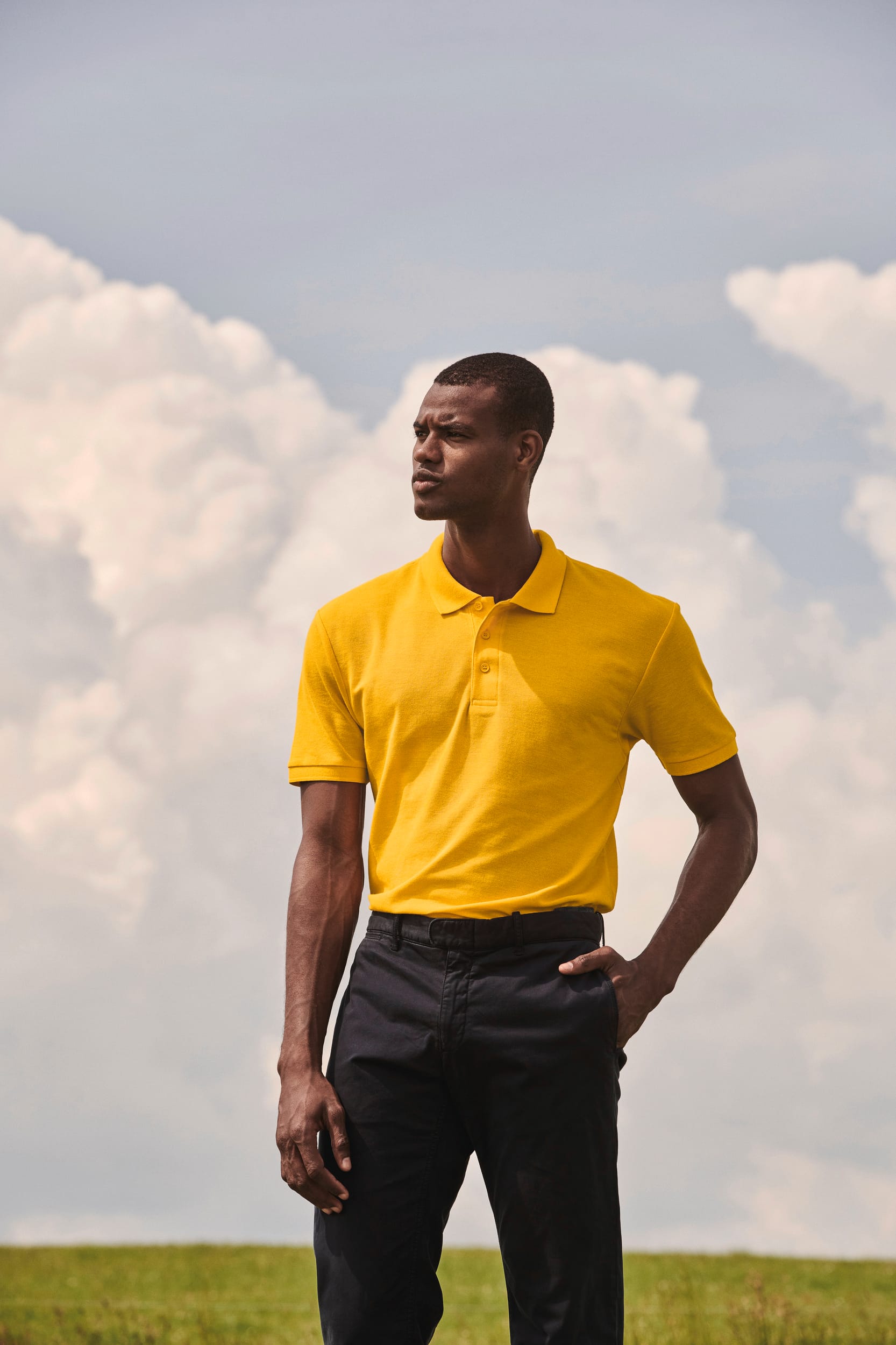 65% polyester / 35% coton. Col et bas de manches en bord côte 1×1. Patte à 3 boutons ton sur ton, rechange cousu à l’intérieur. Bande de propreté au col. Coutures d’épaules renforcées. Lavable à 60°C.