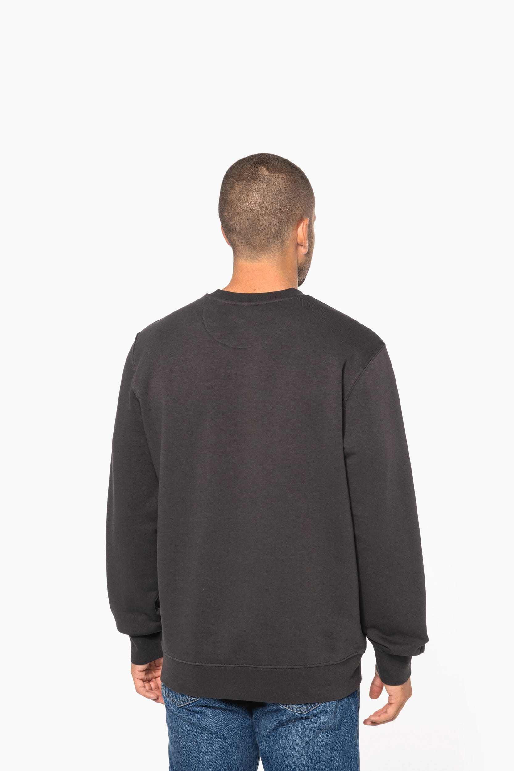 85% coton biologique / 15% polyester recyclé post-consumer. Surface extérieure 100% coton peigné. Molleton gratté 3 fils LSF (Low Shrinkage Fleece). Lavage aux enzymes. Coupe droite. Bord-côte 1×1 montage tubulaire pour une meilleure finition au col, bas de manches et de vêtement. Bande de propreté jersey ton sur ton et finition demi-lune intérieur col. Finition double aiguilles sur bas de manches, bas de vêtement et col. Pas d’étiquette de marque au col, uniquement une puce de taille pour faciliter la personnalisation.
